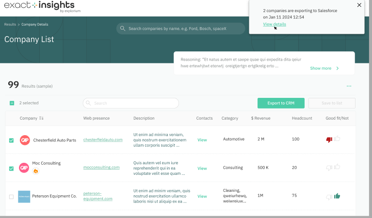 - Select relevant records to be exported in ExactInsights Companies or Contact Lists.