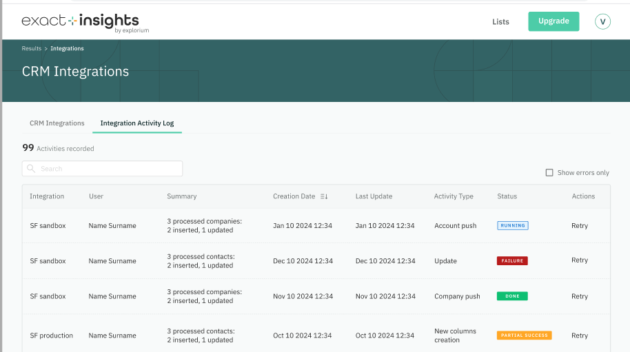 Navigate to “Integrations Activity Log” in the CRM Integrations screen.