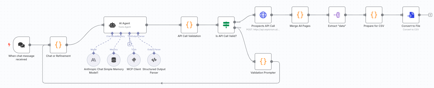 This n8n workflow creates a chatbot that understands natural language requests for finding business prospects and automatically:- Interprets your query using AI (Claude Sonnet 3.7)