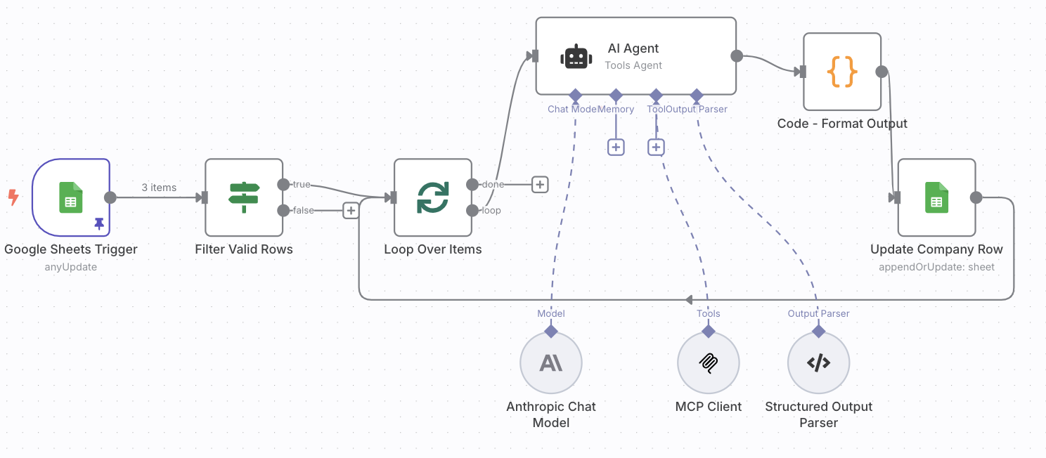 - Automatic Triggering: Monitors your Google Sheet for new rows or updates to company name/website fields