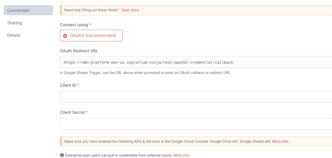You’ll need to set up two Google credentials:Google Sheets Trigger Credentials:
